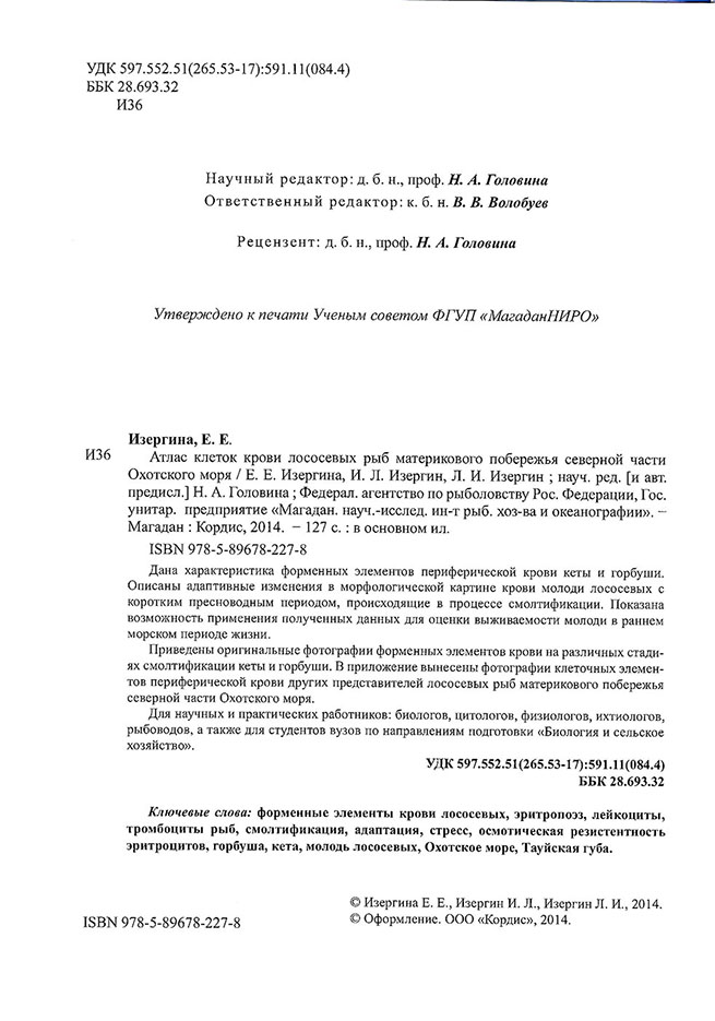Вышла в свет монография: Е.Е. ИЗЕРГИНА, И.Л. ИЗЕРГИН, Л.И. ИЗЕРГИН Атлас клеток крови лососевых рыб материкового побережья северной части Охохотского моря